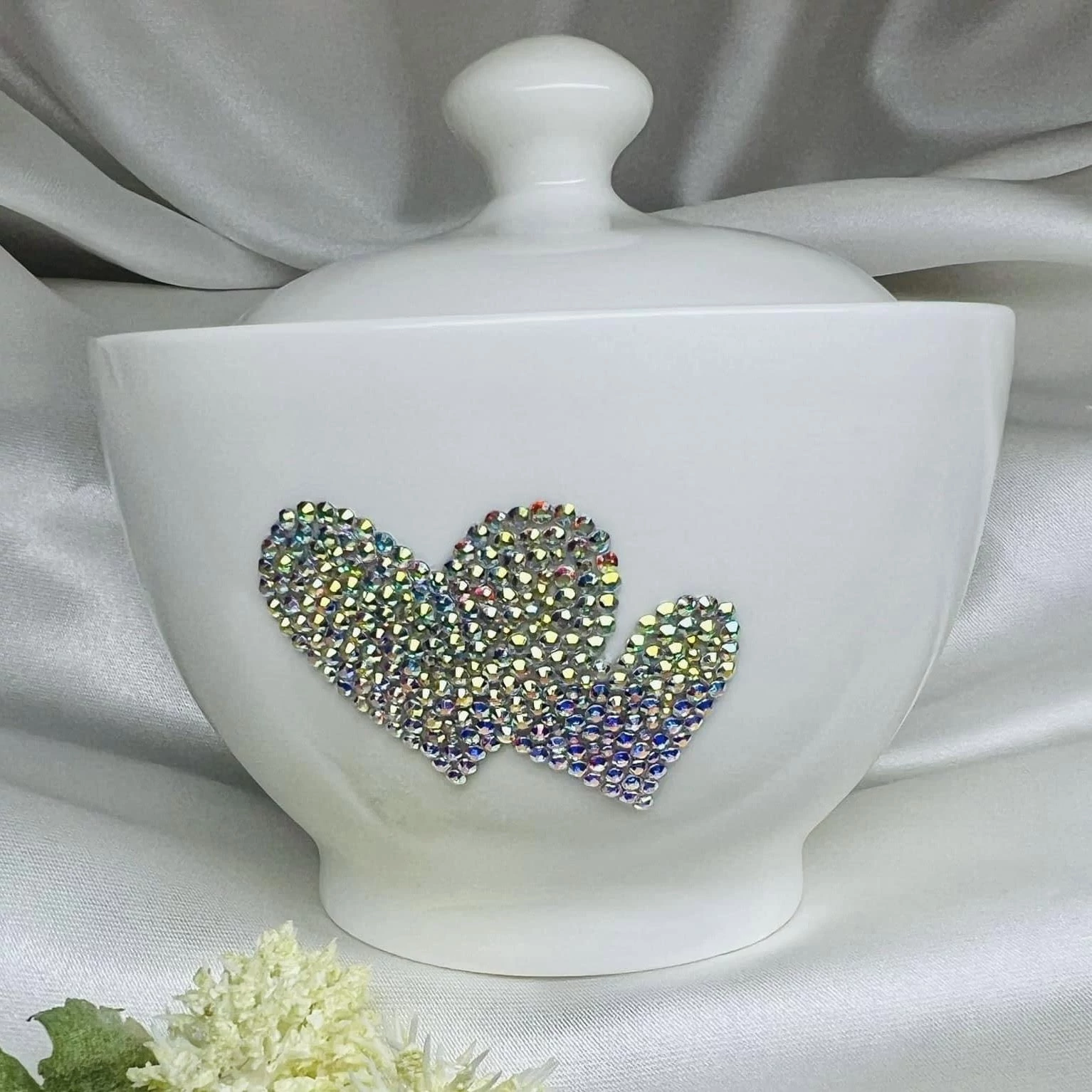 Ez az egyedi, kézzel díszített cukortartó egy igazán különleges ajándék lehet bárki számára. Szív mintája Swarovski kristálykővel kirakva, ez a termék garantáltan egyedi megjelenést kölcsönöz a konyhának. Akár a kávézás varázslatos pillanatait szeretnéd feldobni, akár egy kedves személynek szeretnél meglepetést szerezni, ez a termék remek választás lehet.