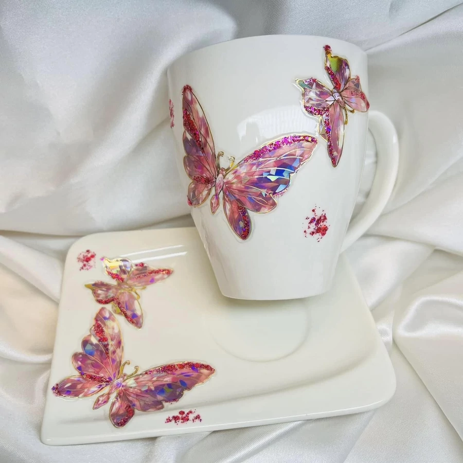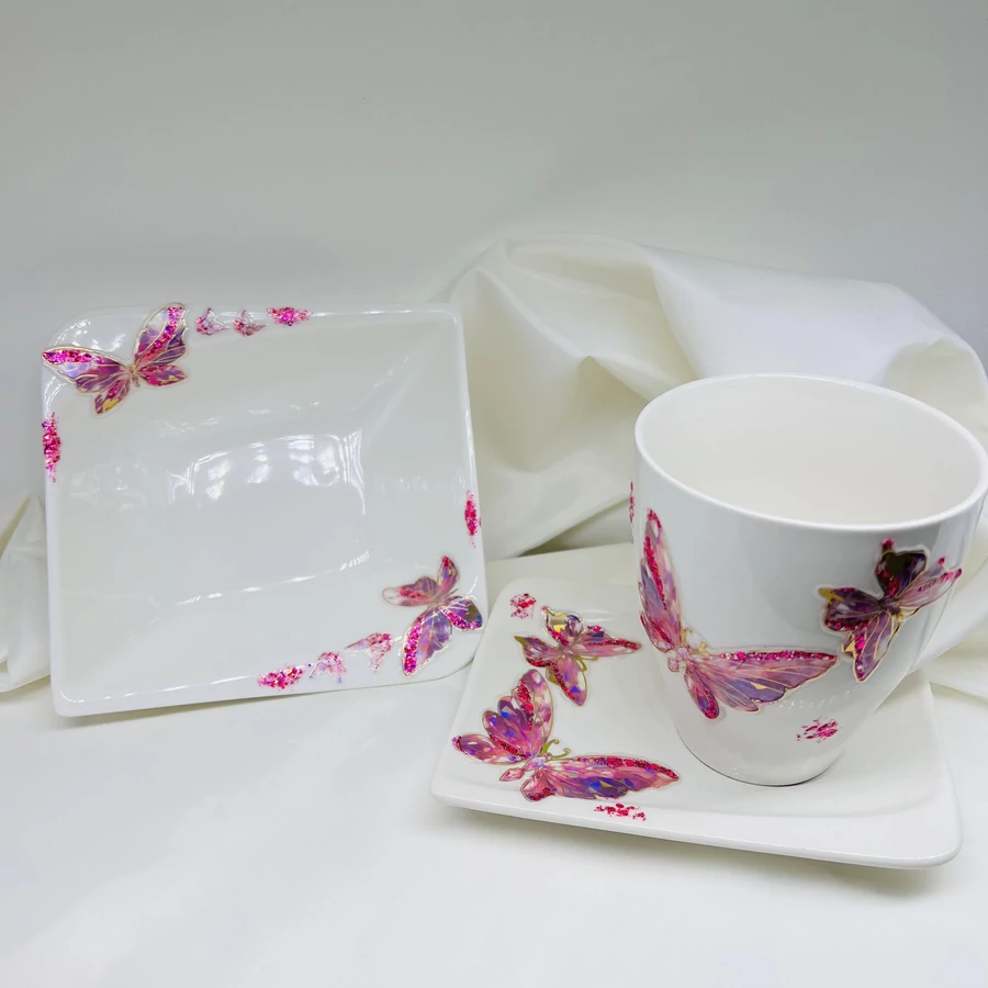 Ez a díszített kávés bögre és kínáló tál egy igazi különlegesség, melyet kézzel díszítettek, csillámló, rózsaszín pillangó motívummal. A termék limitált gyártású, így egyedi ajándék ötlet lehet szeretteink számára. Ideális választás otthoni használatra is, hogy a reggeli kávénkat vagy vendégvárásunkat stílusosan tálalhassuk.
