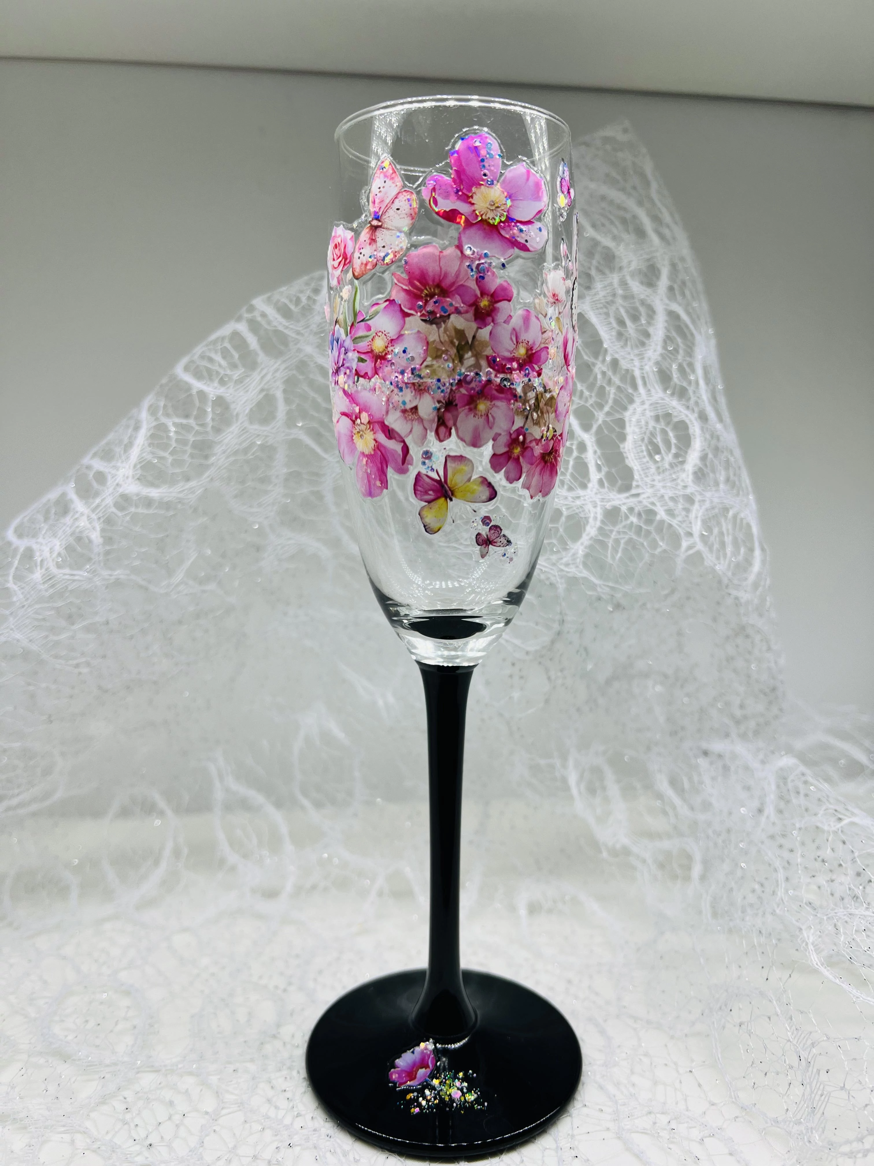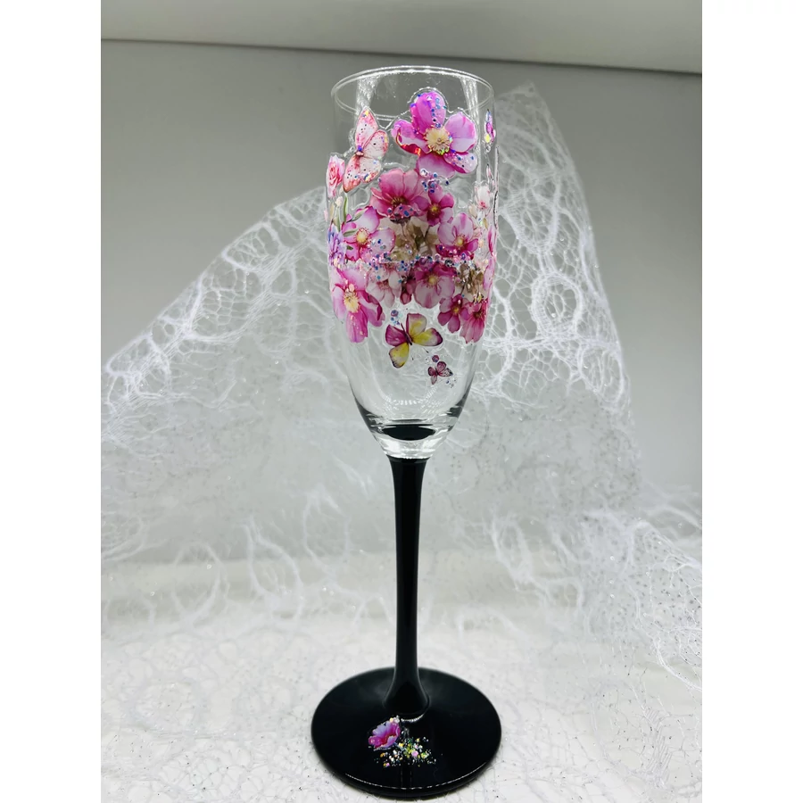 Ez a Pezsgős pohár - Pink virággal egy kézzel készült, limitált darabszámban kapható termék, amely kiváló ajándék lehet esküvőre vagy szalagtűzőre. A pohár szépségét egy rózsaszín virág díszíti, ami elegáns és romantikus hangulatot kölcsönöz neki.