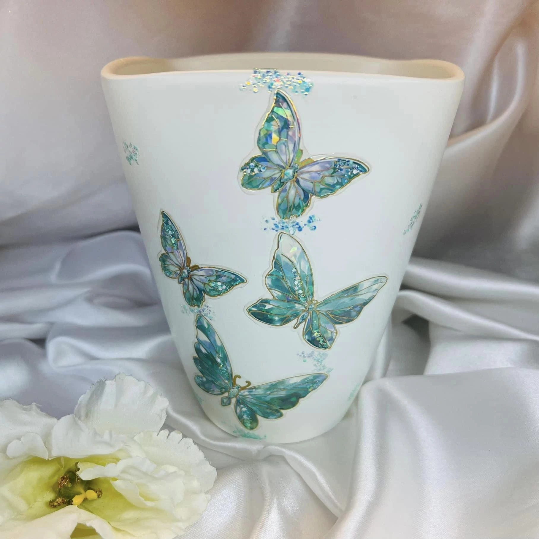 Dekoratív, egyedi megjelenésű, kézzel díszített virágkaspó. Csilámló zöld pillangó motívumokkal ellátott, melyek vízállók.